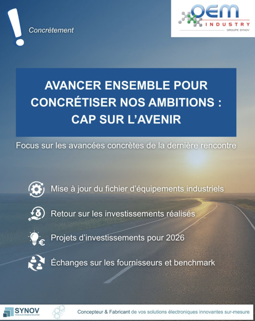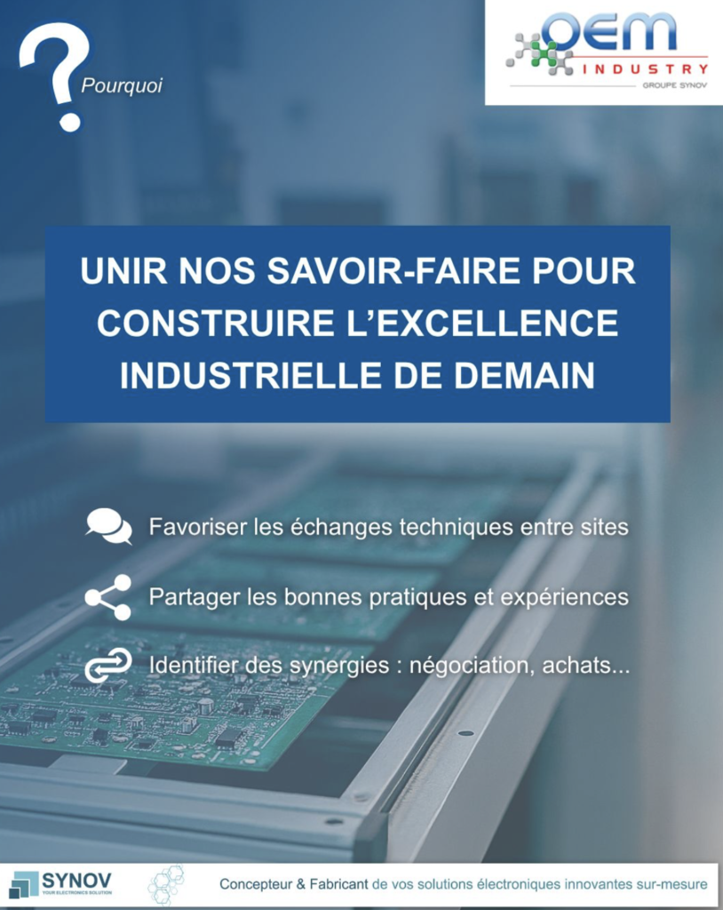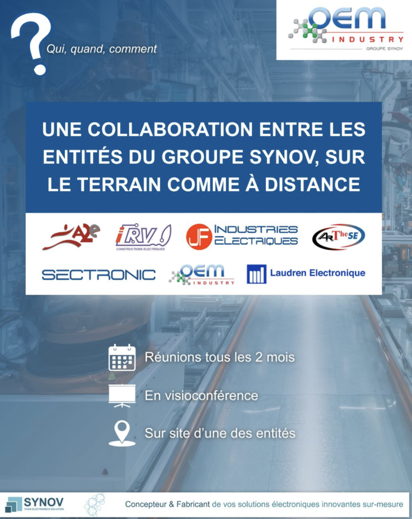 Réunissant les équipes de A2E Conception et Production de Systèmes Electroniques « Groupe SYNOV », Constructions Electriques R.V., JF Industries Electriques, SECTRONIC, LAUDREN ELECTRONIQUE, ARTHESE et OEM INDUSTRY, ce groupe se retrouve tous les deux mois, en visioconférence ou sur site, pour mieux comprendre les environnements et les moyens de production de chacun.